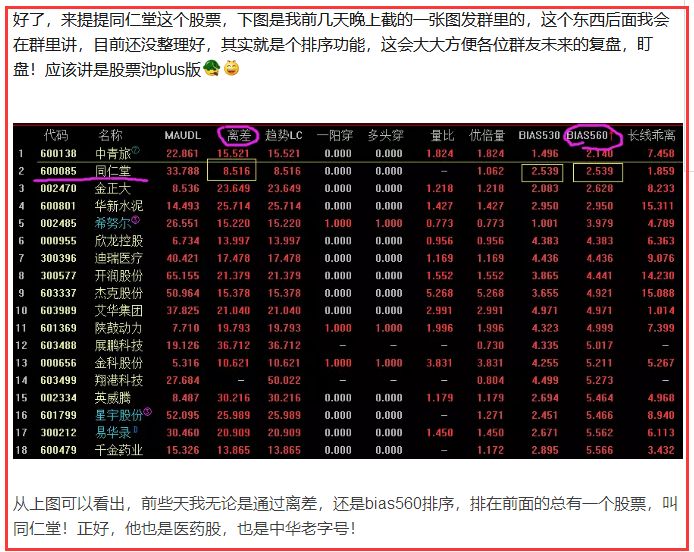 离差其实也挺有意思,这个和布林带宽有些类似,但能做到相辅相成,我2018年4月5日晚上一篇关于同仁堂操盘心得的文章中提到,那几天就通过离差排序,看得上眼的股票,也就这个600085同仁堂操盘思路和心得!