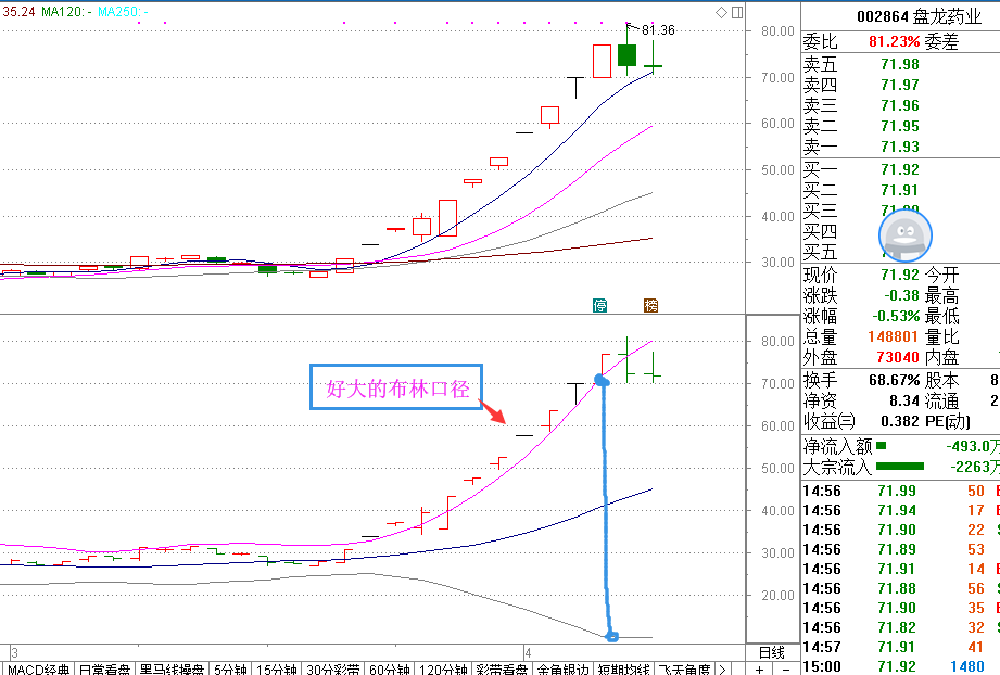 看看盘龙药业,好大的布林口径,有些朋友往往就追在这种口径很大的位置,当然他前几天还在连续涨停板,如果追进去,买对了,可能成为你意淫好几天的资本,尤其一些炒股交流群,不明事理的小韭菜,可能很羡慕,这人真厉害,一抓一个涨停板,其实他抓板被套的根本没和你提过!股票一旦加速上涨,盘中波动振幅就会很大,极端的强者恒强继续涨,但也有可能一买进,当天就让你大亏7-8%!这种东西啊,就是赌,就如之前有人赌乐视,说兄弟们上啊,对了会所嫩模,错了工地搬砖!