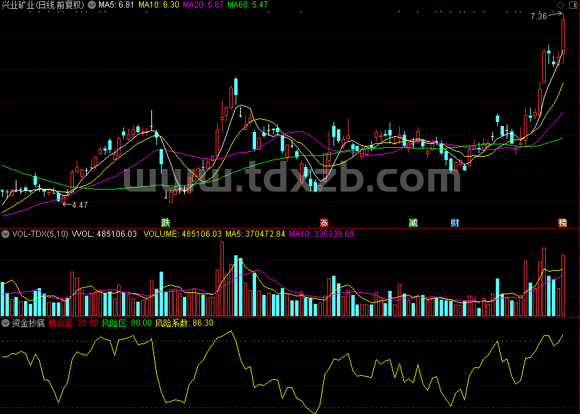 风险系数:0.5*相对强弱+0.5*短线波段,COLORYELLOW;CD1:=IF(风险系数<20 AND CLOSE>OPEN AND DDX>0,1,0);
