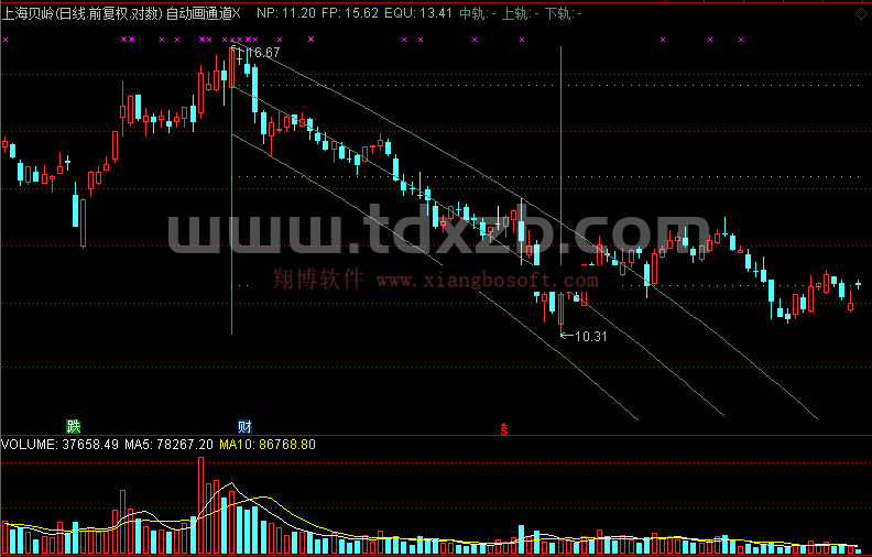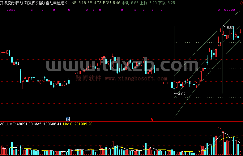 下轨:IF(NP>FP,IF(UTL<=RH,UTL,DRAWNULL),IF(UTL>=RL,UTL,DRAWNULL)),COLOR628962;