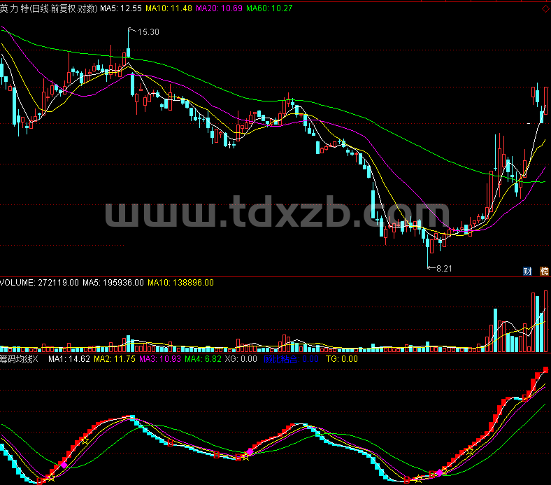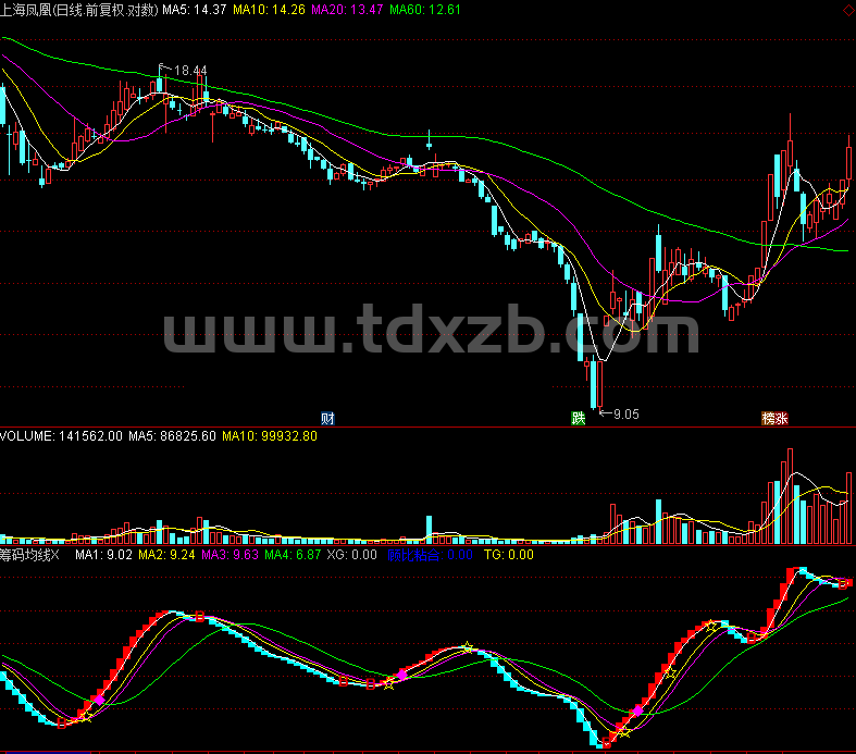 TG:CROSS(VAR2,MA4) AND V<=HHV(V,15)*0.9,LINETHICK0;