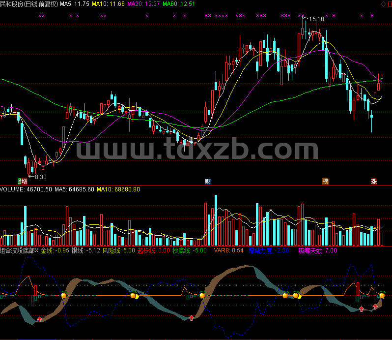VAR11:=EMA(IF(LOW<=VAR5,(VAR4+VAR6*2)/2,0),3)/618*VAR7*(-1);