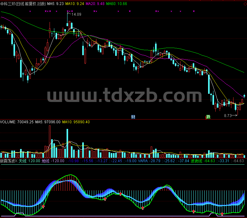 波浪线:SMA((VAR11-50)*2,3,1)+SMA((VAR10-50)*2,3,1)/2,LINETHICK2,COLORGREEN;
