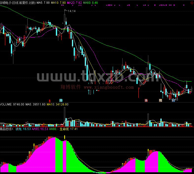 AA55:IF(领先>REF(领先,1),领先,DRAWNULL),COLORMAGENTA,LINETHICK1;