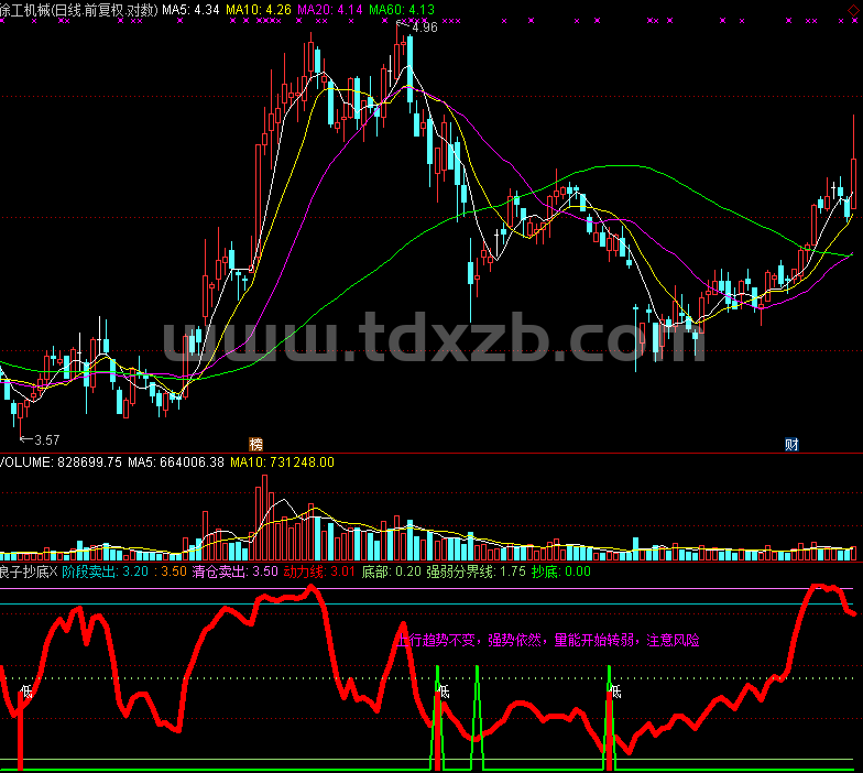 ,'上行趋势不变,强势依然,量能开始转弱,注意风险'),COLORFF00FF ;