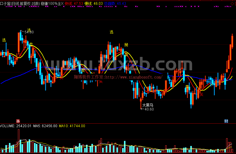 大黑马:= CROSS(趋势线3,0) AND 黑马线<40 AND DATE>=1080701;