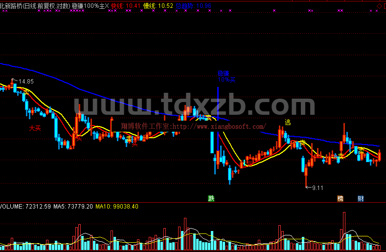 DRAWTEXT(CROSS(新庄,散户) AND 新庄>75,HIGH*1.04,'抛'),COLOR00FFFF;