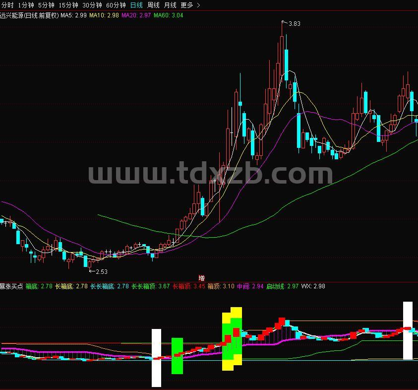 当满足条件WX上穿长箱顶时,在长箱顶-0.8和长箱顶+0.8位置之间画柱状线,宽度为10,0不为0则画空心柱. ,画黄色,线宽为2