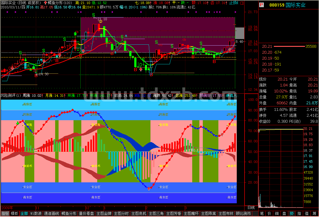 {DRAWTEXT(FILTER(CLOSE>0,25),50,'(投资区)'),COLORBROWN;}