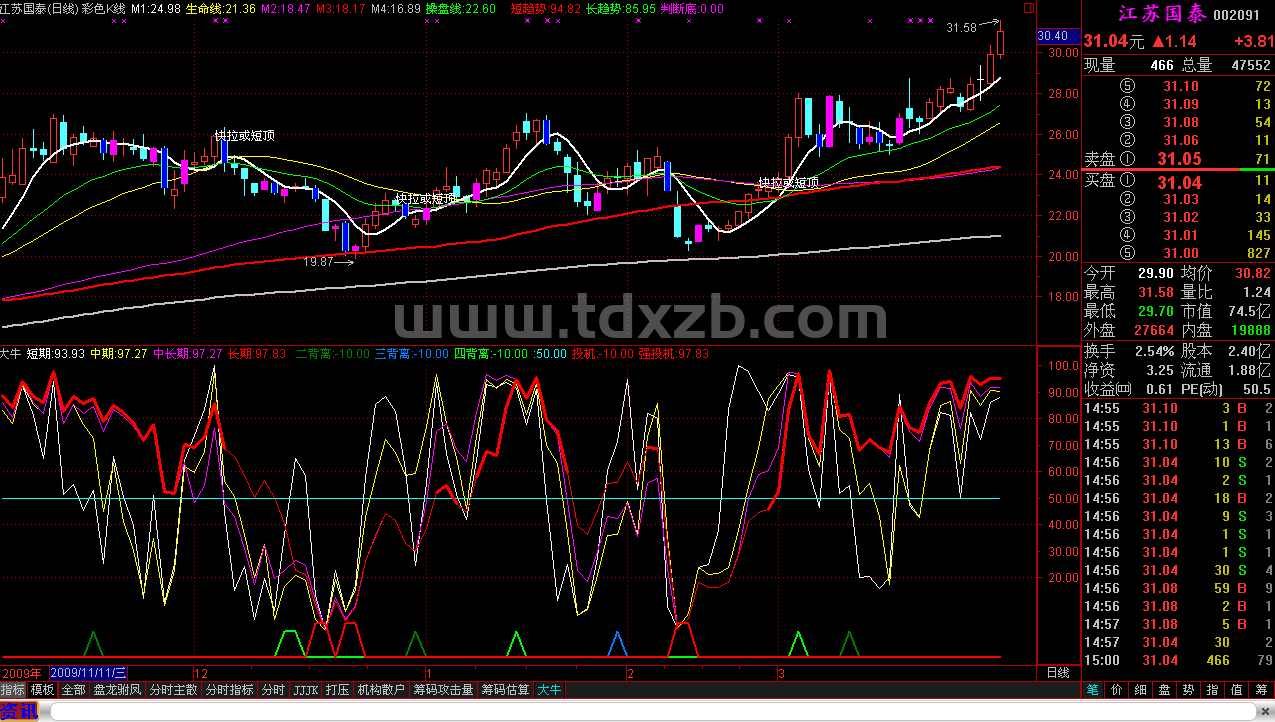 强投机4:IF(中长期>=45 AND 长期>=45,长期,DRAWNULL),COLORRED,LINETHICK2;
