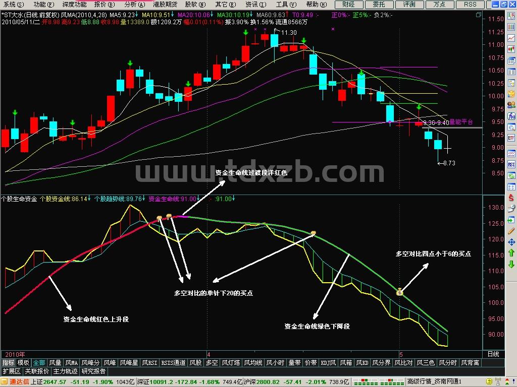 IF(资金生命线<=REF(资金生命线,1),资金生命线,DRAWNULL),COLORGREEN,LINETHICK2;