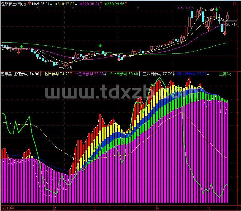 主流认知:EMA(100*(INDEXC-LLV(INDEXL,34))/(HHV(INDEXH,34)-LLV (INDEXL,34)),3),COLORGREEN,LINETHICK2;