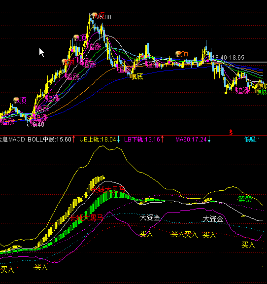 中波:=EMA(HZ,26),COLORFF00FF,LINETHICK1;