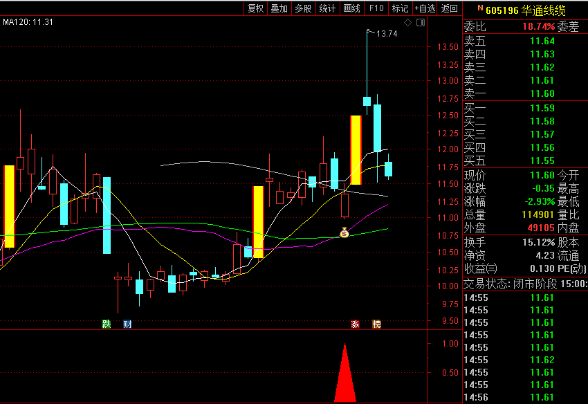 他符合左异动右微妙的这样一种特征,左边呢,是一个60日均线,这个紫色均线是60日均线,我这个均线呢设置了三条,白色的是十日均,黄色的是啊十日均线,紫色的是60日均线,这个地方是60日均线的一个涨停板有了这个涨停板呢。他的技术构造啊打下了一个基石,其实这个位置上啊,如果我们画一根线的话啊,你还可以发现啊,这个地方其实它还是具有平台特征的啊,有单K的平台特征,那么也增加了整个技术特征的一个稳定性啊。