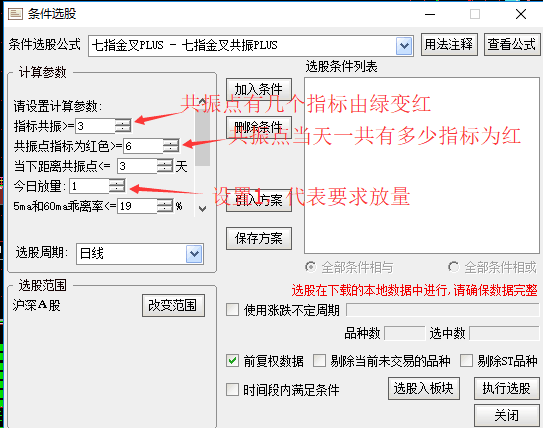 好了,关于这个七指金叉的指标,我就讲到这里,强大的七指金叉选股公式,而且是2个版本的七指金叉选股公式,一个选共振点,一个选共振点附近,无论是你盘后复盘选股,还是盘中预警,都会达到省时省力的效果。