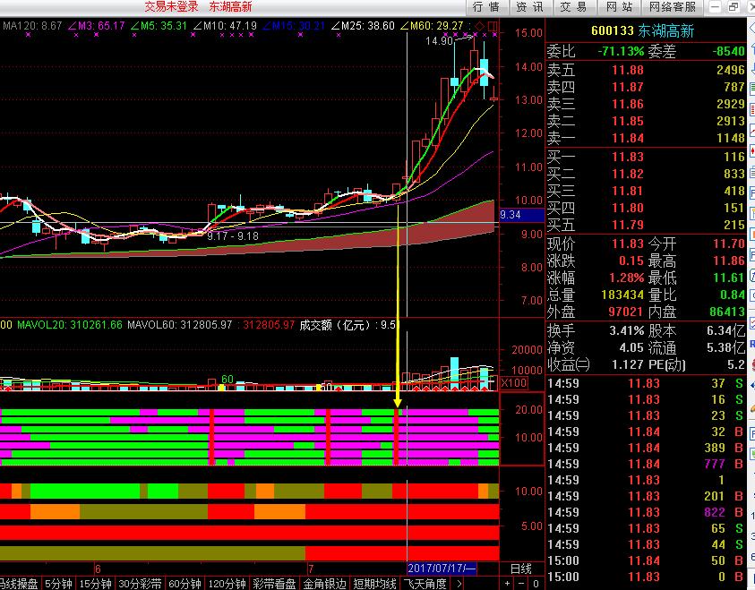 当然啦,对于不太明显的N形态股票我们可以做他第一波上涨,这个时候你可以集合本人的四喜临门指标,龙门线指标来研判大趋势,结合七指金叉信号做买进,可能你买的就是N形态第一波上涨形态,或者横盘整理后刚刚突破的位置。我翻看历史走势,像今年的一些牛股,什么湖南天雁,天山股份,博深工具,神火股份,方大炭素等等都会在启动点时出现七指金叉信号。当然一定要配合大趋势,其实我在编写这个指标的时候,在筹码里面我是加上了ema均线的控制,把趋势稍微控制一下,因为这个指标,如果你用反了,趋势如果为空头,出现七指金叉共振信号,往往都是反弹的高点。