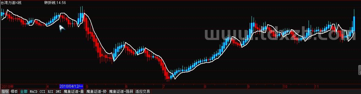 转折线:IF(A4=-1,MA(HIGH,6),MA(LOW,6))LINETHICK2,COLORFFFFFF;