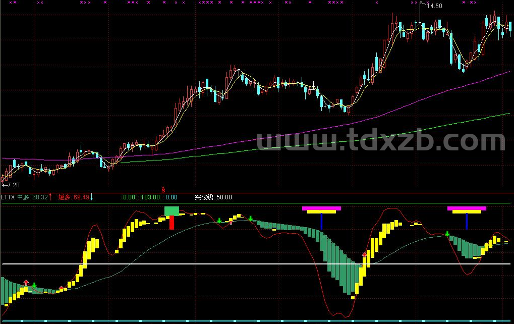 STICKLINE(DIFF>=0 AND DEA>=DIFF AND REF(DIFF,1)>REF(DEA,1),97,100,40,0),COLORFF00FF;