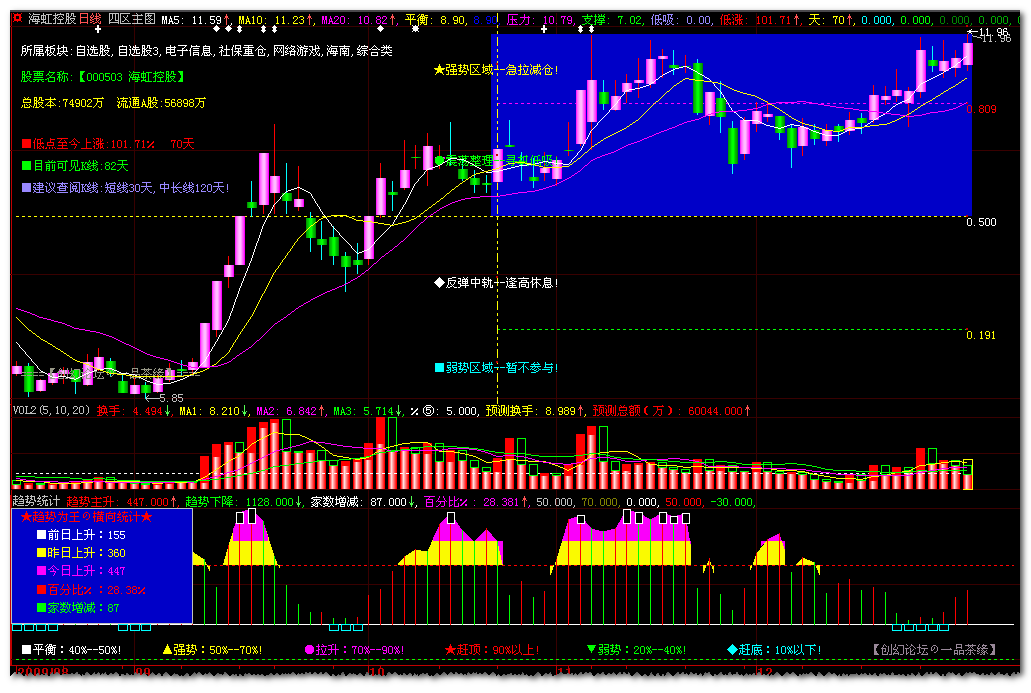 DRAWTEXT(CURRBARSCOUNT=N/2+9,DD+KJ/10,'■弱势区域--暂不参与!'),COLORFFFF00;