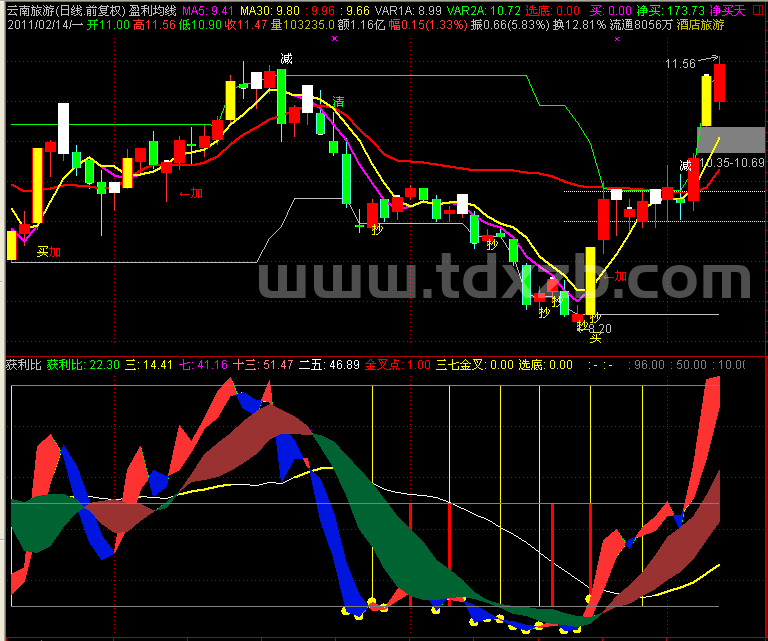 金叉点:CROSS(获利比,三),COLORRED,NODRAW;