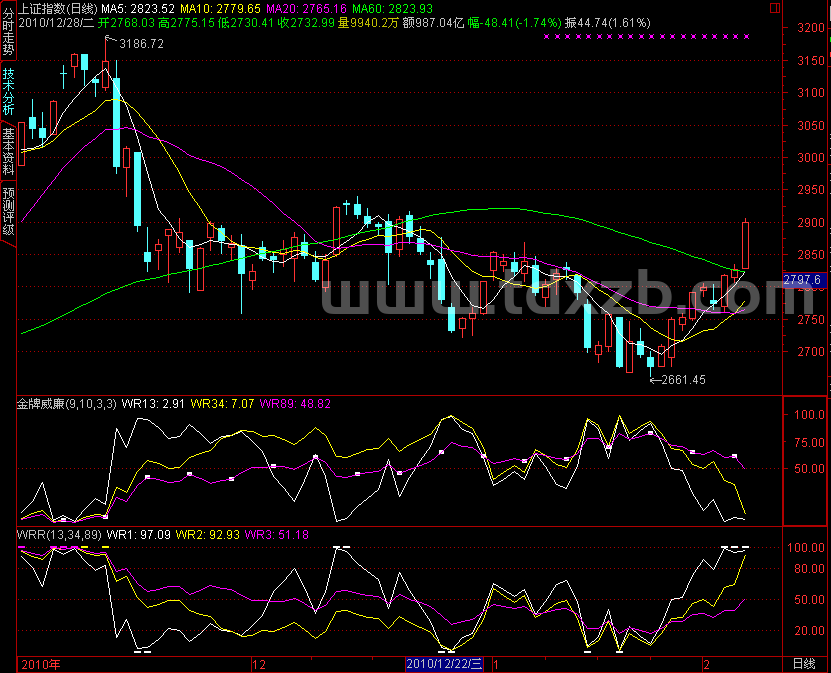 下图为上证指数近期日线截图,附图上面为金牌威廉,下面为WRR指标。