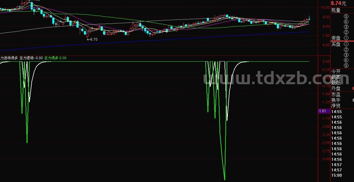 主力退场:IF(VAR5>REF(VAR5,1),VAR5,0),LINETHICK2,COLORWHITE;
