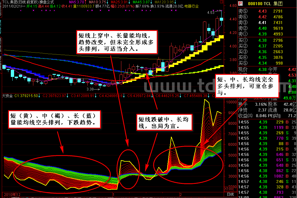 3、和股价的平均线原理相同,分多头排列和空头排列;