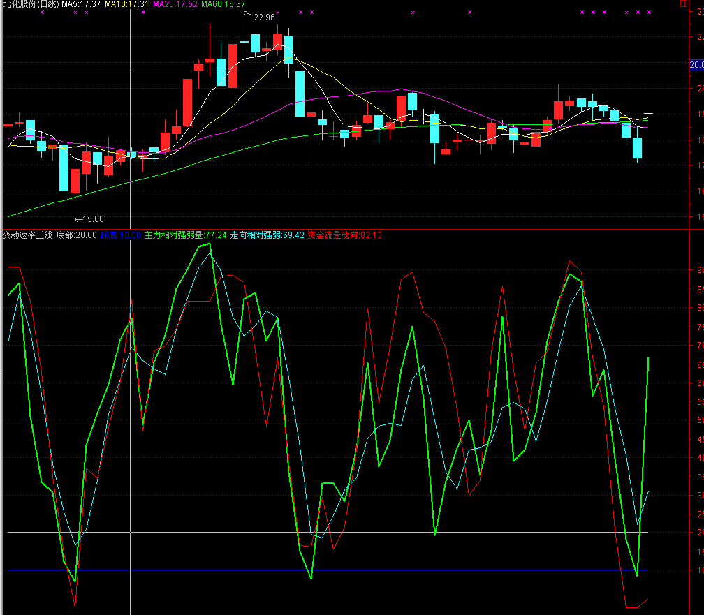 用法:(变动速率三线)绿色是主力控股强弱线、青色线是股走势强弱、红色线资金流量动向,底部分2条预警线,一条在10蓝色线为超底、一条在20白色线为底部,(变动速率三线)不管那条线进入20-10内都是预警有短线机会买入注意关注,公式是死的人是活的,动动脑子结合其它公式。祝大家股市牛市大胆操作,熊市小心谨慎。
