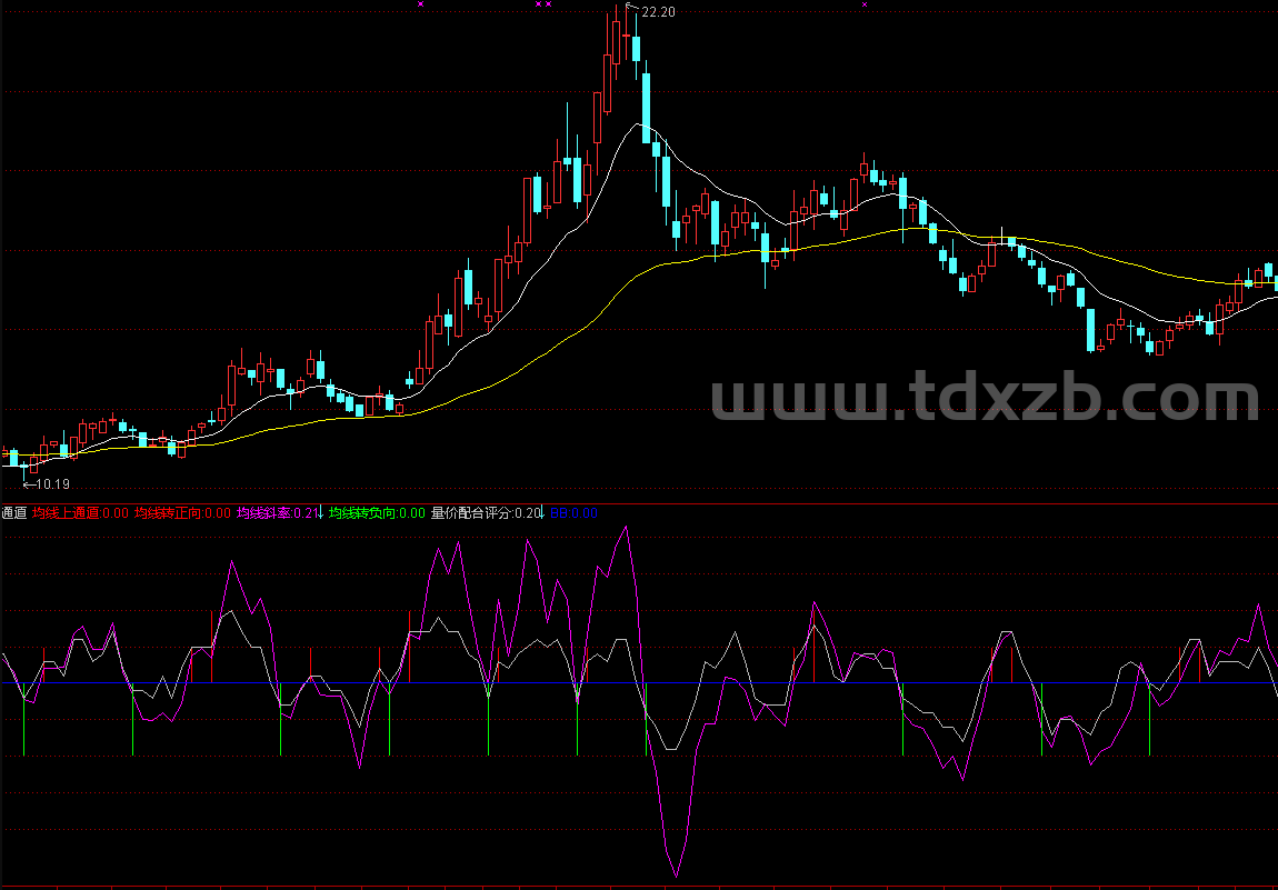 均线上通道:D+IF(D>0 AND (MA(C,13)-REF(MA(C,13),1))>0,1,0)STICK,COLORRED;