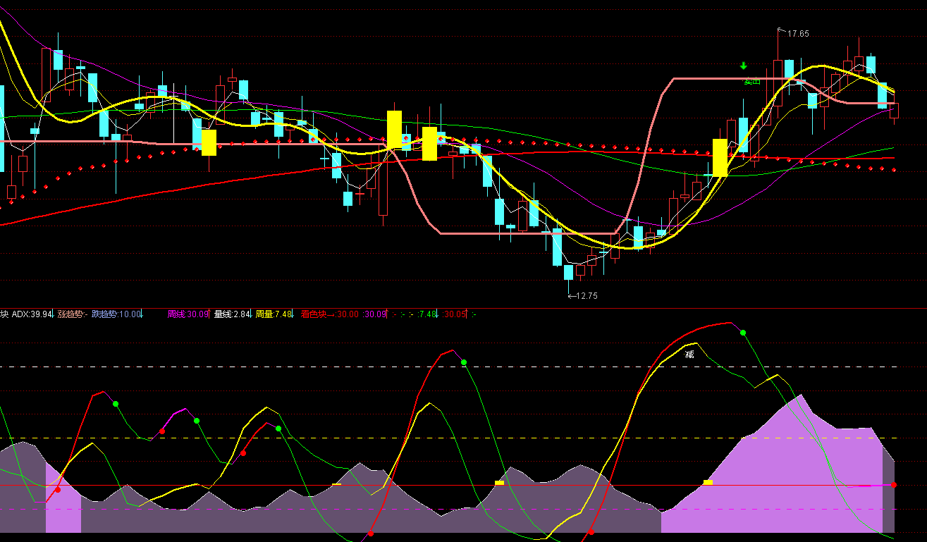 跌趋势:IF((MDI-PDI)/(MDI+PDI)>=0,10,ADX),COLORDD9988,NODRAW;