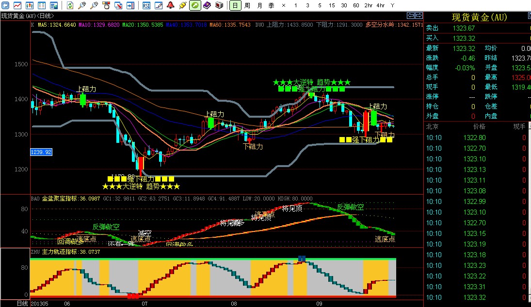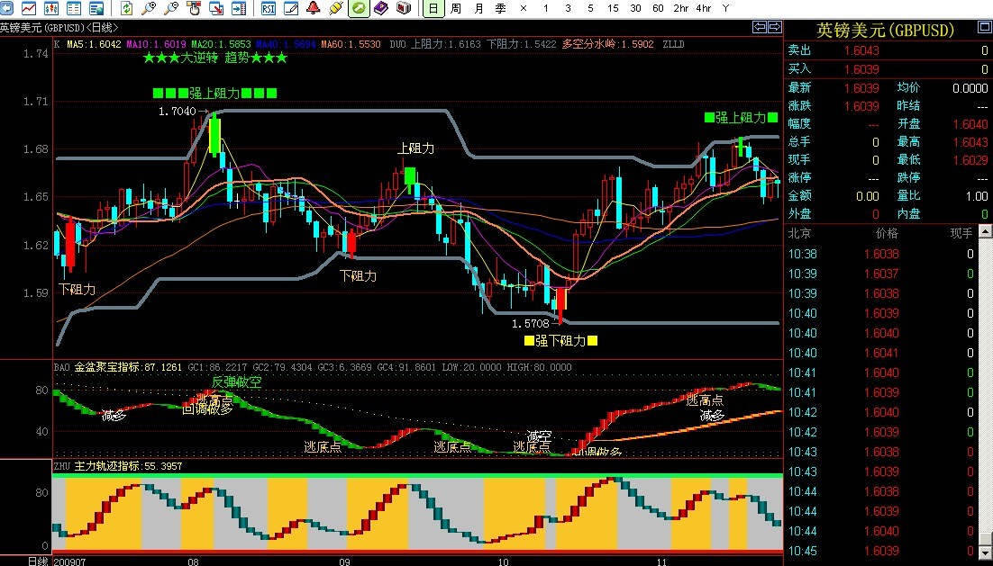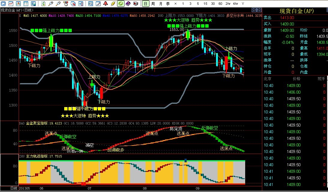 4、【主力轨迹】主力轨迹指标是位于K线图附图上的由红柱与蓝柱波浪相连交替出现,并在红柱后方显示金黄色背景的反应当前行情各级波动的灵敏指标。主力轨迹指标的独立运用需要排查不同时间K线图,当出现顶底相接的圆润弧型波动排列时,金黄色背景成大块显示时,便可根据此指标进行多空波段的精准操作。