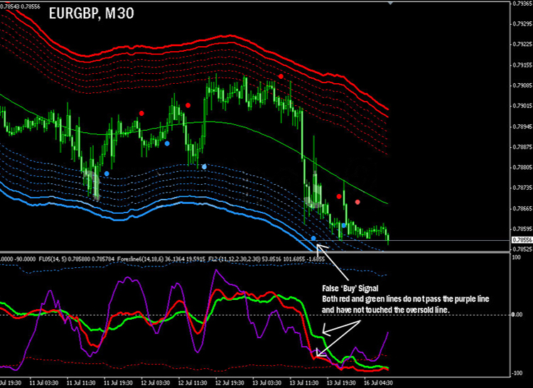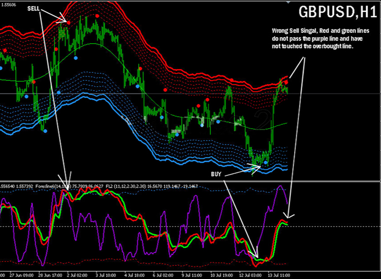 a. k线价格虽然到达红色阻力带区,但是下面的红绿线没有到达超买线,虚假反转信号。