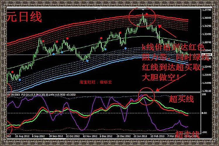 2.开仓做空条件:k线价格必须到达红色阻力带区,出现红色圆点,同时,还要满足下面的红线 绿线到达超买线。