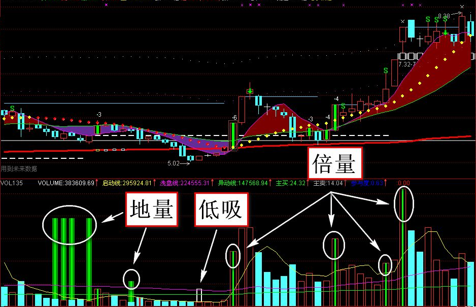 5、均量线为5日(启动线)、35日(洗盘线)和135日(异动线);