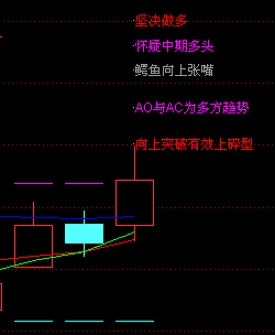 DRAWTEXT(X1>0&&ISLASTBAR=1,H+0.3,'AO与AC为多方趋势'),COLORFF00FF;