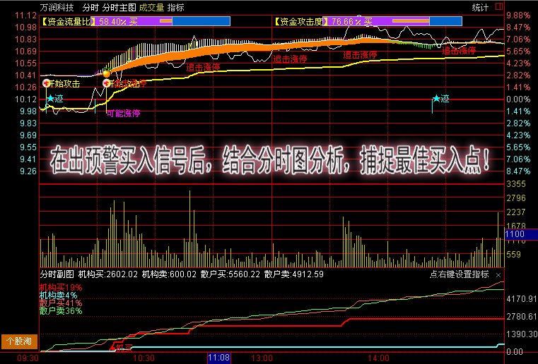 超短线机会:涨停板后的第二天,股价盘中回调到涨停板这天的分时均线或二分位附近时,是超短线的买入机会,第三天在第二天的较高价附近获利卖出!
