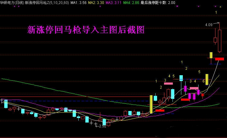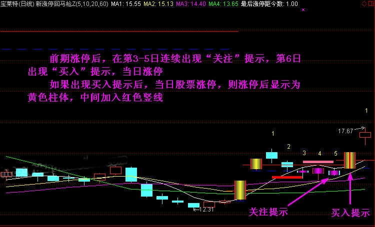 新的升级涨停回马枪日线副图F为您提供:涨停提示、关注提示(预备买入信号)、买入提示(买入信号)等