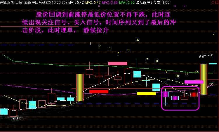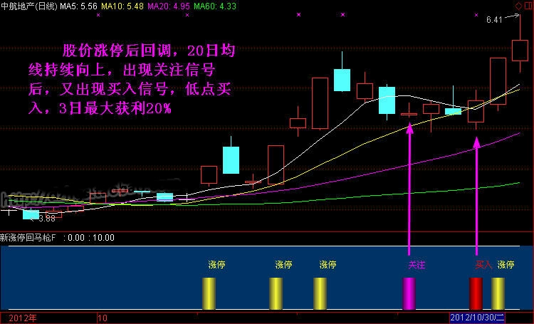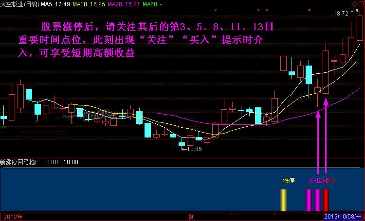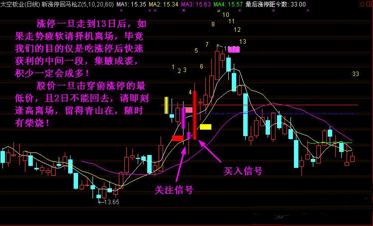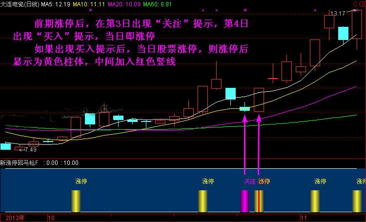 涨停回马枪,顾名思义就是有了涨停后,我们抓回调后再次上涨的一段,股价已经上涨且以涨停明示(关注度直线上升),所以我们建议,使用涨停回马枪只做短线,可以长期做此股波段,尽量不要长期连续持有,此新版涨停回马枪特适合做超短线,快进快出,盈利为先,赚5-20点就好,集腋成裘,一旦股价击穿前涨停板 低价2日未回,或涨停13日后未见明显走强,请择机逢高离场.