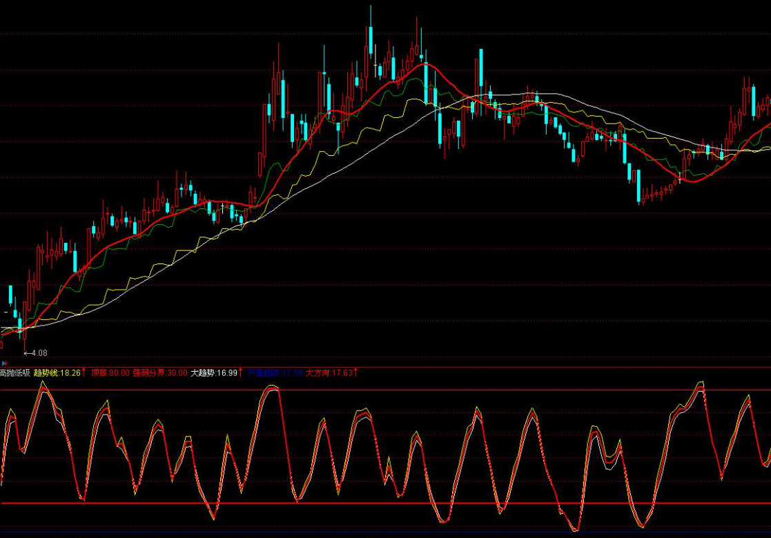 五周:(REF(CLOSE,T)+REF(CLOSE,T1)+REF(CLOSE,T2)+REF(CLOSE,T3)+CLOSE)/5,LINETHICK1,COLOR00AA00;