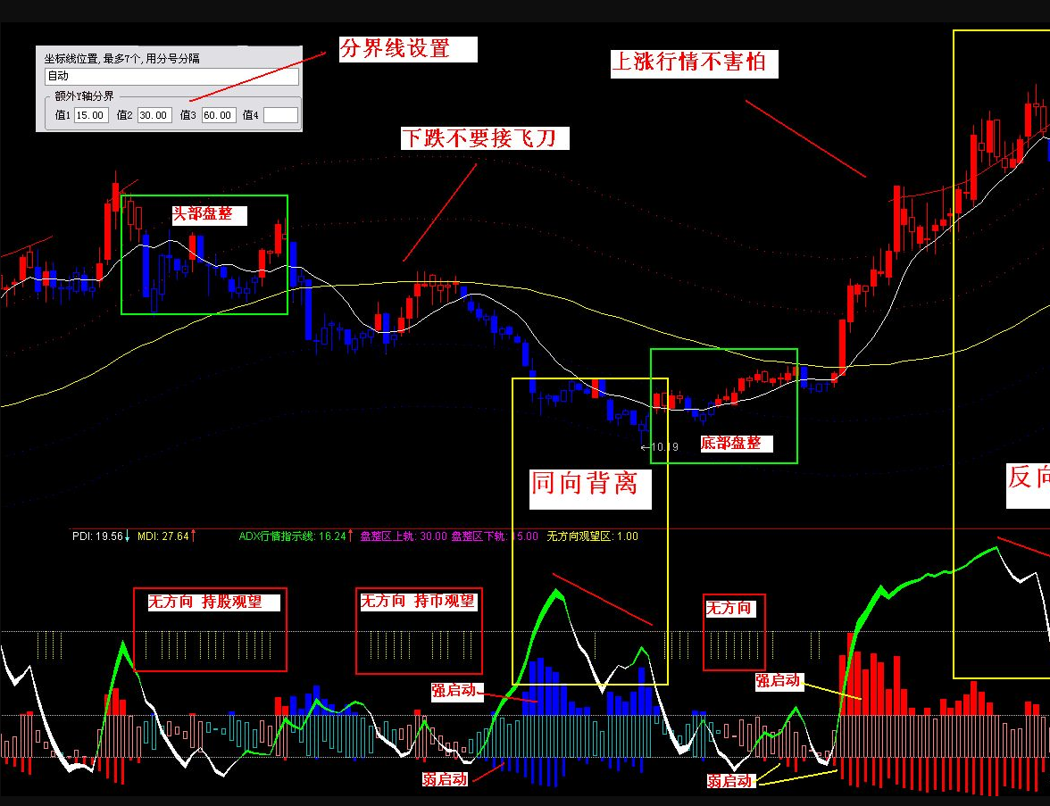 DRAWBAND(ADX行情指示线,RGB(0,255,0),确认线,RGB(255,255,255));