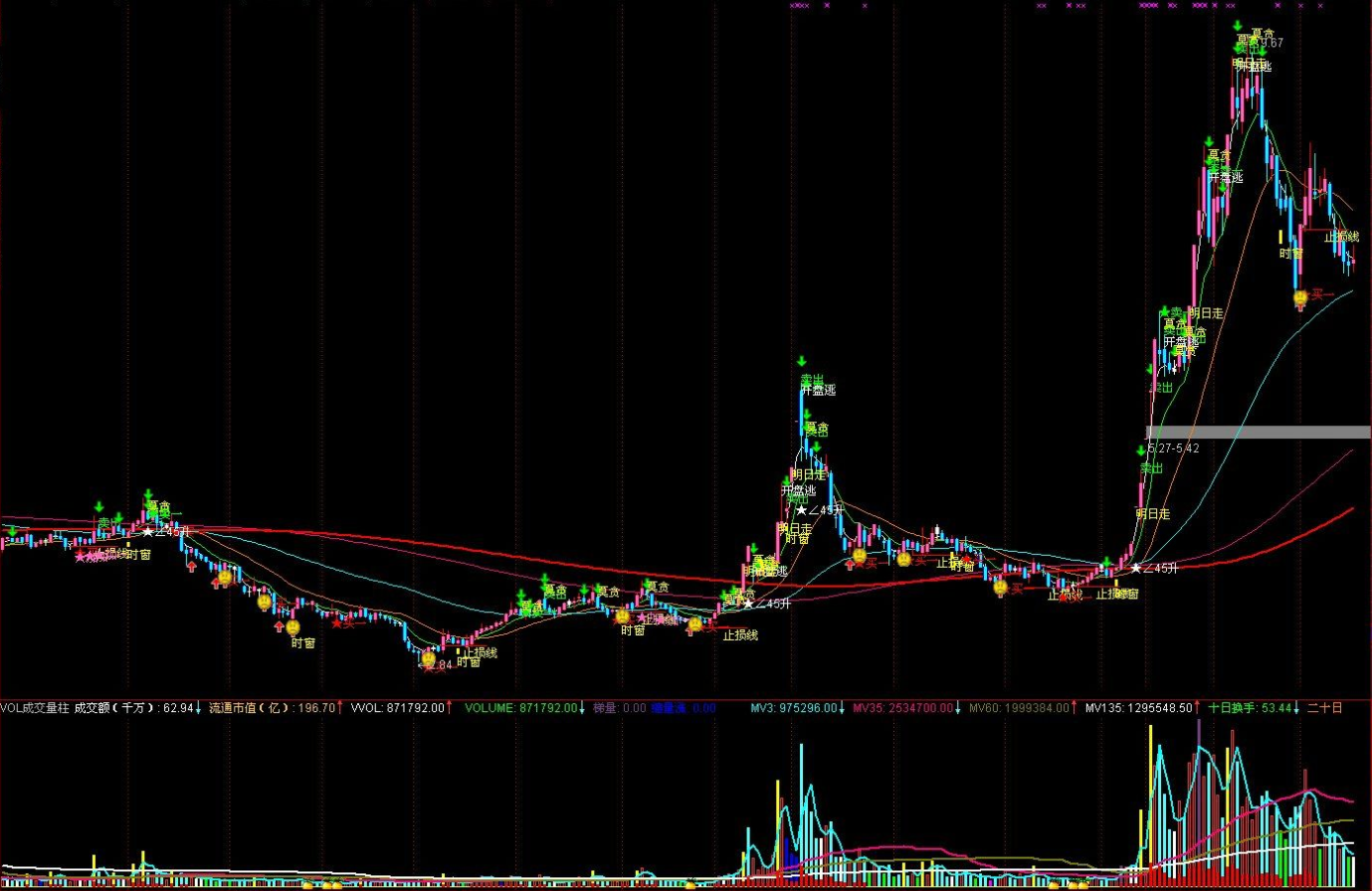 OPEN>REF(CLOSE,1),1,0),LOW,'●买进'), COLORRED;