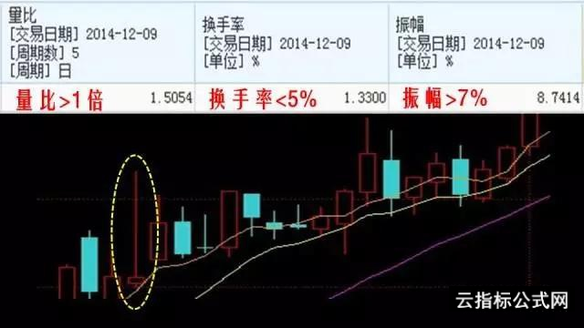 3、当天量比1倍以上,换手率在5%以内,振幅在7%以上。