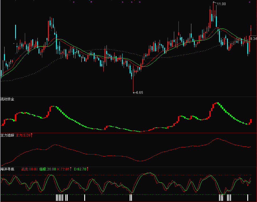 海洋寻底指标:这是一个在市场出现群体超跌中用于选股和买股的指标,成功率达到95%以上,在08年群体超跌的市场中无坚不摧,屡次捕捉到超跌的有爆发力的牛股。