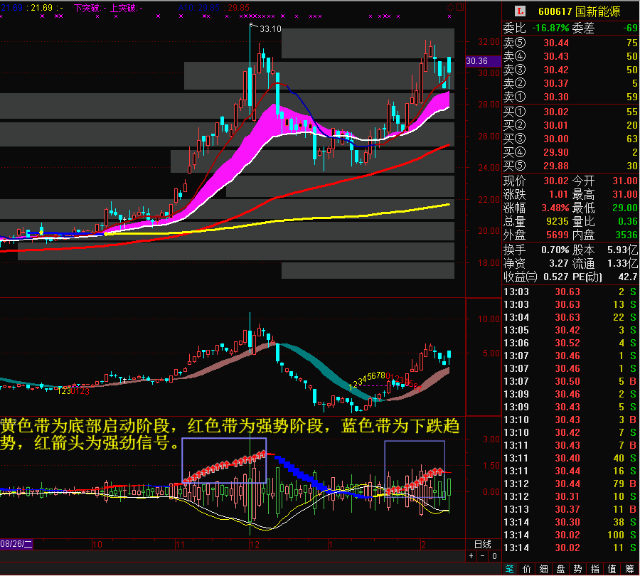 黄色带为底部启动阶段,红色带为强势阶段,蓝色带为下跌趋势,红箭头为强劲信号。K线平铺更能发现其中奥妙,慢慢体会吧!