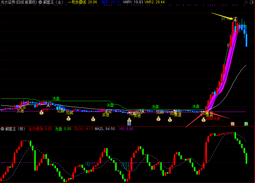 这【解套王】指标,简直就是股市里的“导航仪”,能帮你找到进出的最佳时机。它有两大核心功能: