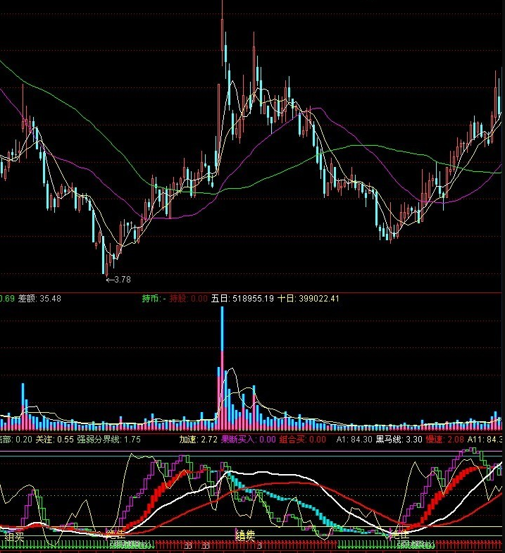 黑马线:EMA(A1,5)/24,LINETHICK2,{COLOR6600FF},COLORWHITE;