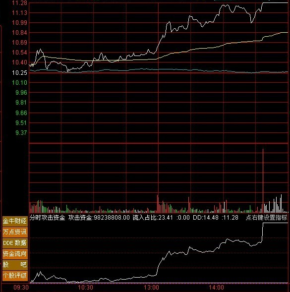 早上开盘后白线在零线上方运行,流入占比越来越大,量比越大越好.绝不被套.有高手请改为日k线副图和分时一样那多好!