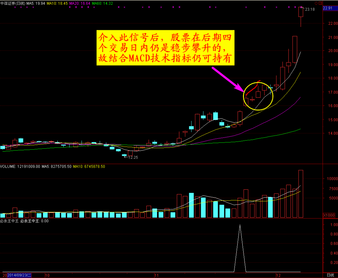 3,如何区别能持有做中线的信号,以600030为例来说,此股出信号后当然介入有获利,第二天高开高走,后面四个交易日都是不停的上攻,所以象这样的票,暂时可以持有做一下中线的。中线定义目标是25%左右,目标附近可自行抛出。