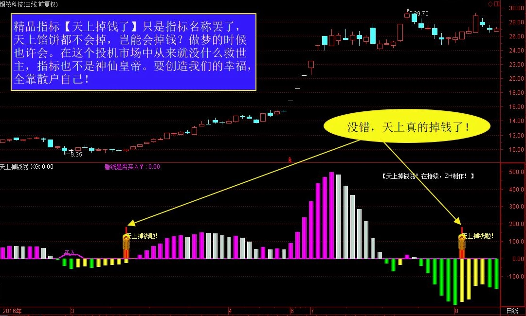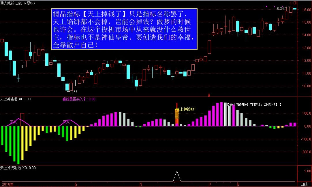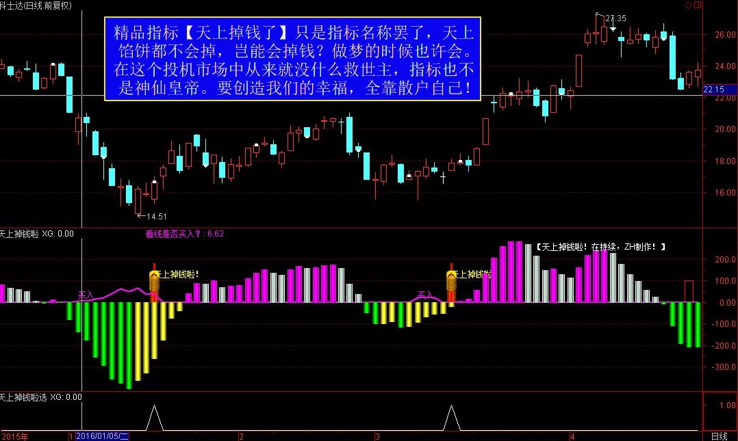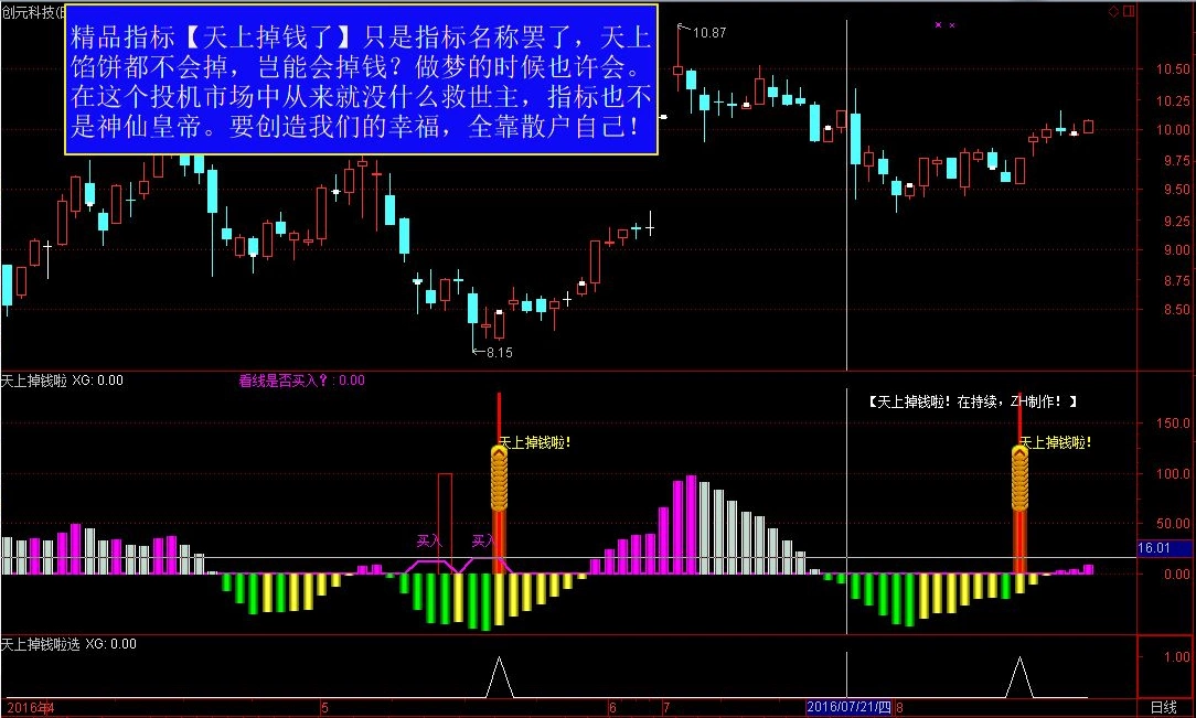 此指标只是名称罢了,请不要混淆,世上任何的财富都必须要通过辛勤的劳动获得。是用辛勤的工作得来的。【天上掉钱啦】只是人们的遐想,在现实生活中,除非你会预见未来。就算真的【天上掉钱啦】,也很有可能是个大陷井!!