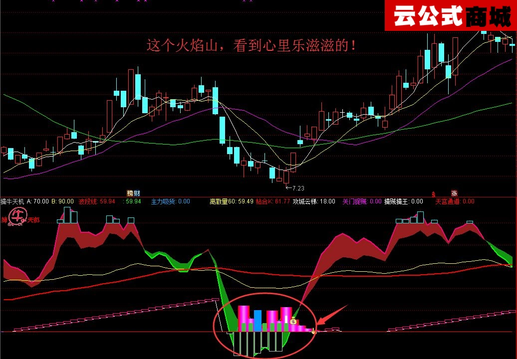 1.出现火焰山(红黄色各色柱体)和钱袋子图标,提醒准备资金,等到有买入信号时买入,成功率倍增;